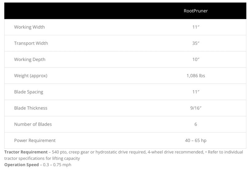 The Imants RootPruner is a one pass root pruning system that can prune roots up to 6” in diameter with minimal surface disrution and no need for clean up. The RootPruner’s unique action of cutting the root in two areas prevents root encroachment into vital areas, eliminates loss of valuable water and nutrients, and prevents surface damage. It also has the ability to decompact tight, narrow areas with ease. The RootPruner includes a unique patented triple-reduction planetary gearbox for smooth, maximum torque drive to rotor shaft. The RootPruner also features a factory set, torque limiting PTO shaft.